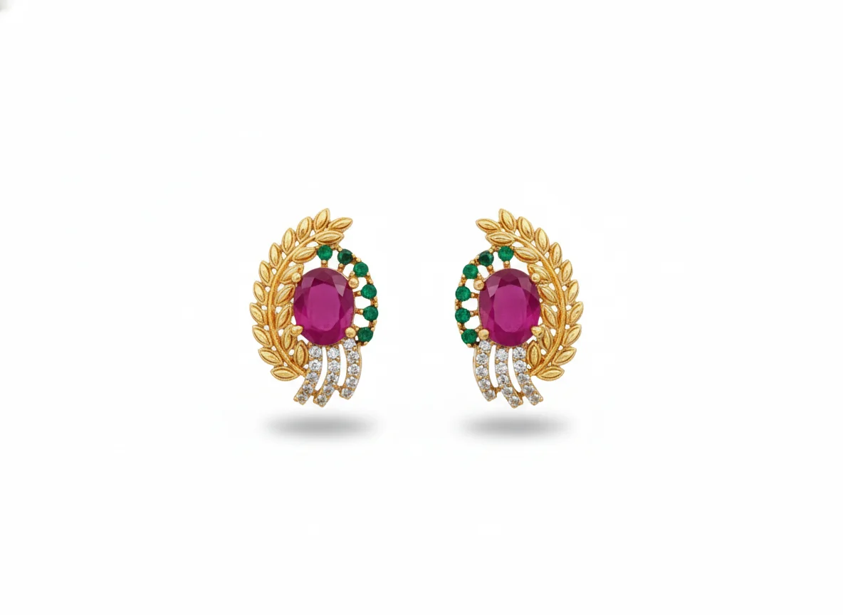 There’s something so effortlessly graceful about a leaf motif, and these studs nail that “nature-inspired” look perfectly. The antique matte gold finish gives them a very high-end, muted glow that doesn’t scream for attention but definitely gets it. Centered with a bold ruby-pink stone and hugged by tiny emerald accents, they have that perfect pop of color. They’re lightweight enough for an all-day event but look substantial enough to be your main accessory. It’s that perfect “Modern Grace” piece for when you want to look put-through without trying too hard.
