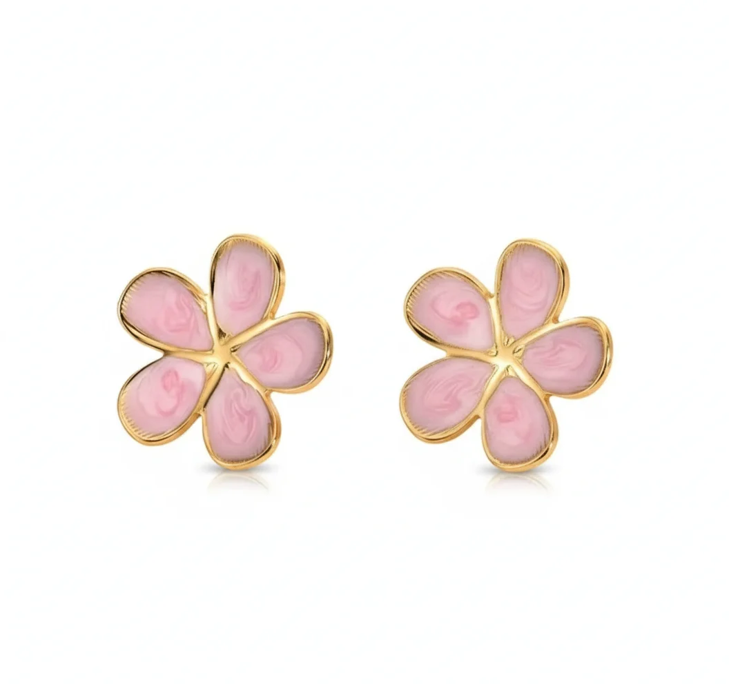 Elegant plum blossom floral studs featuring a smooth, polished inlay. These 18k gold PVD earrings provide a durable, anti-tarnish luster, making them a versatile and timeless choice for daily wear across all five color variations.